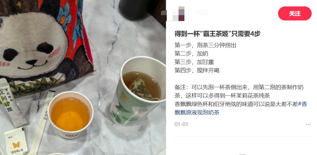 和香飄飄經(jīng)典沖泡奶茶的簡單包裝不一樣,香飄飄的“原葉現(xiàn)泡”系列,是奶與茶分開,料包包括袋泡茶、牛乳鎖鮮杯和甘露(糖漿)。新系列的沖泡過程也更繁瑣,給足了用戶“特調(diào)”的感覺;在體驗上,有不少網(wǎng)友認(rèn)為,“原葉現(xiàn)泡”系列的口感堪比平替版“伯牙絕弦”。