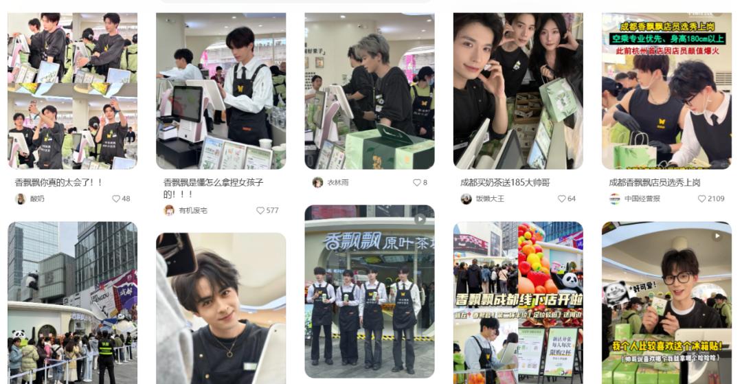 今年3月,香飄飄還將快閃店開到了熱鬧的成都春熙路。成都快閃店開業(yè)之前,香飄飄還發(fā)布了店員招聘信息,要求身高180cm以上、空乘專業(yè)優(yōu)先、氣質(zhì)形象佳。同時還模仿內(nèi)娛選秀,將27位制茶男店員的形象照發(fā)到微博上,讓網(wǎng)友投票決定最終的錄用;這也直接讓香飄飄成都店的經(jīng)營,變成了“制茶男團”粉絲線下見面會。