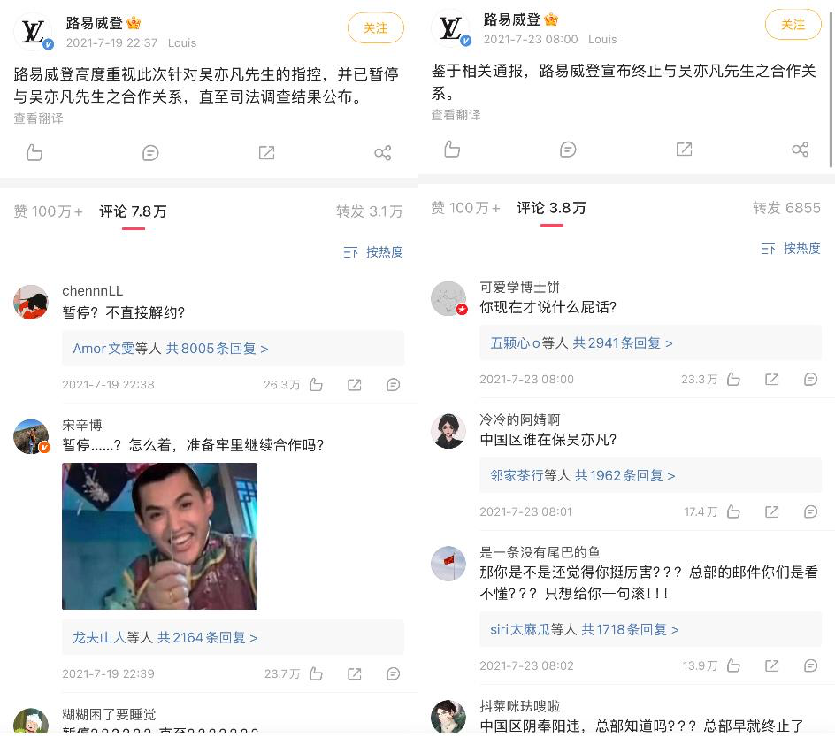 比如2021年,吳亦凡作為LV近百年首次官宣的全球代言人被曝出丑聞,保時捷、寶格麗等超過14家品牌快速與其終止合作,只剩LV一家品牌堅守,稱要“等待司法調(diào)查結(jié)果公布”,4天后盡管終止合作,還是難息眾怒。