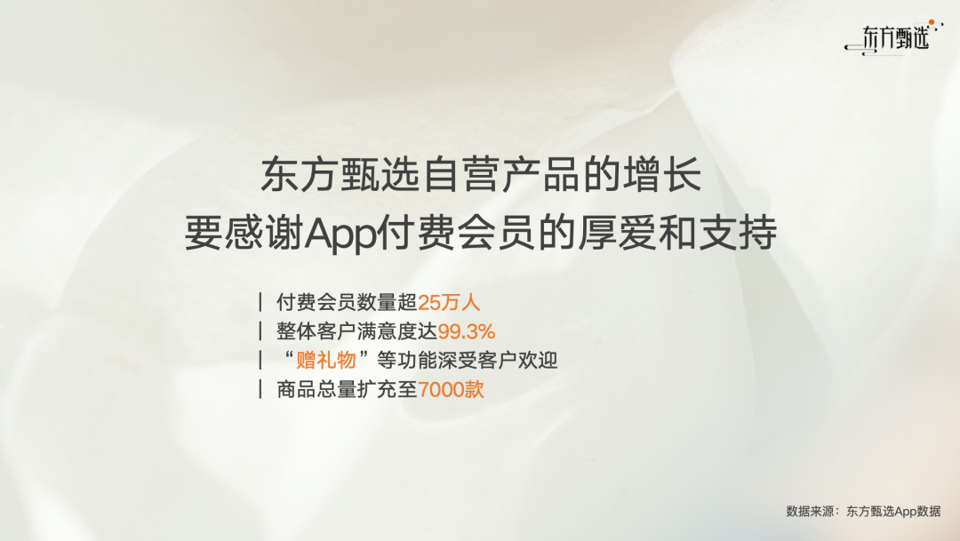 今年3月,東方甄選官方微信公眾號發(fā)布文章,表示東方甄選自營產(chǎn)品三年來全網(wǎng)累計銷量超過2.1億單,APP付費會員超過25萬人,并且自營品中60%的銷量都來自于貨架渠道。