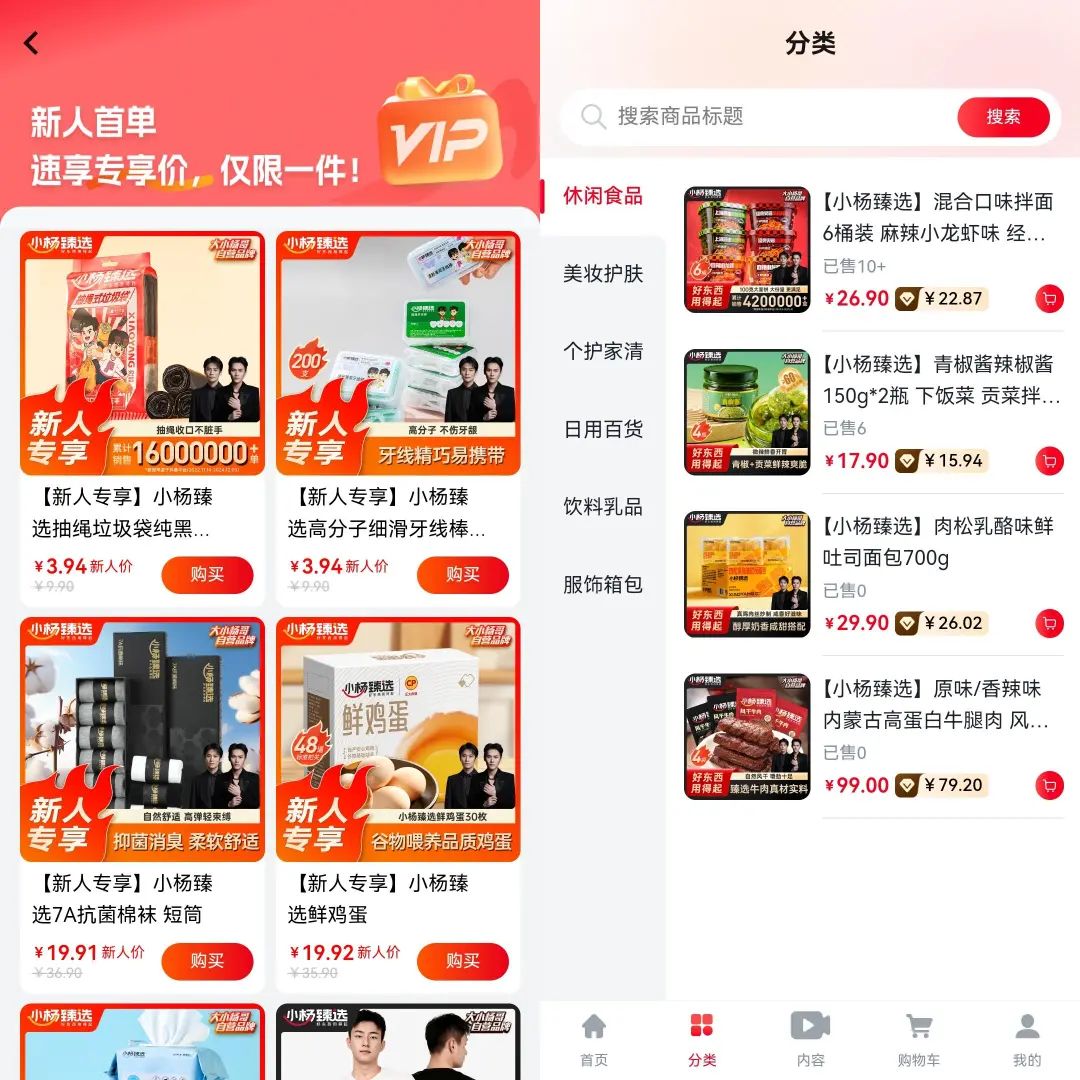 除卻各類自營商品外,APP首頁最為顯眼的就是新人首單福利,鮮雞蛋、抽繩垃圾袋和棉襪等商品,售價低至3.94元,最高的售價也不過19.92元,這些都是小楊臻選曾經(jīng)的爆款單品,部分單品全網(wǎng)銷量已超1600萬件,低價和日用品的高頻消費屬性,足夠吸引新用戶下單。
