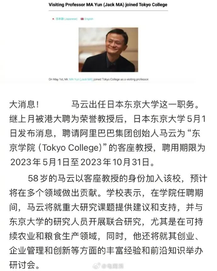 根據(jù)官方信息,馬云的聘任期是從2023年5月1日至2023年10月31日,如今聘任期早已結(jié)束,此次他現(xiàn)身東京大學的具體原因,尚不得而知。