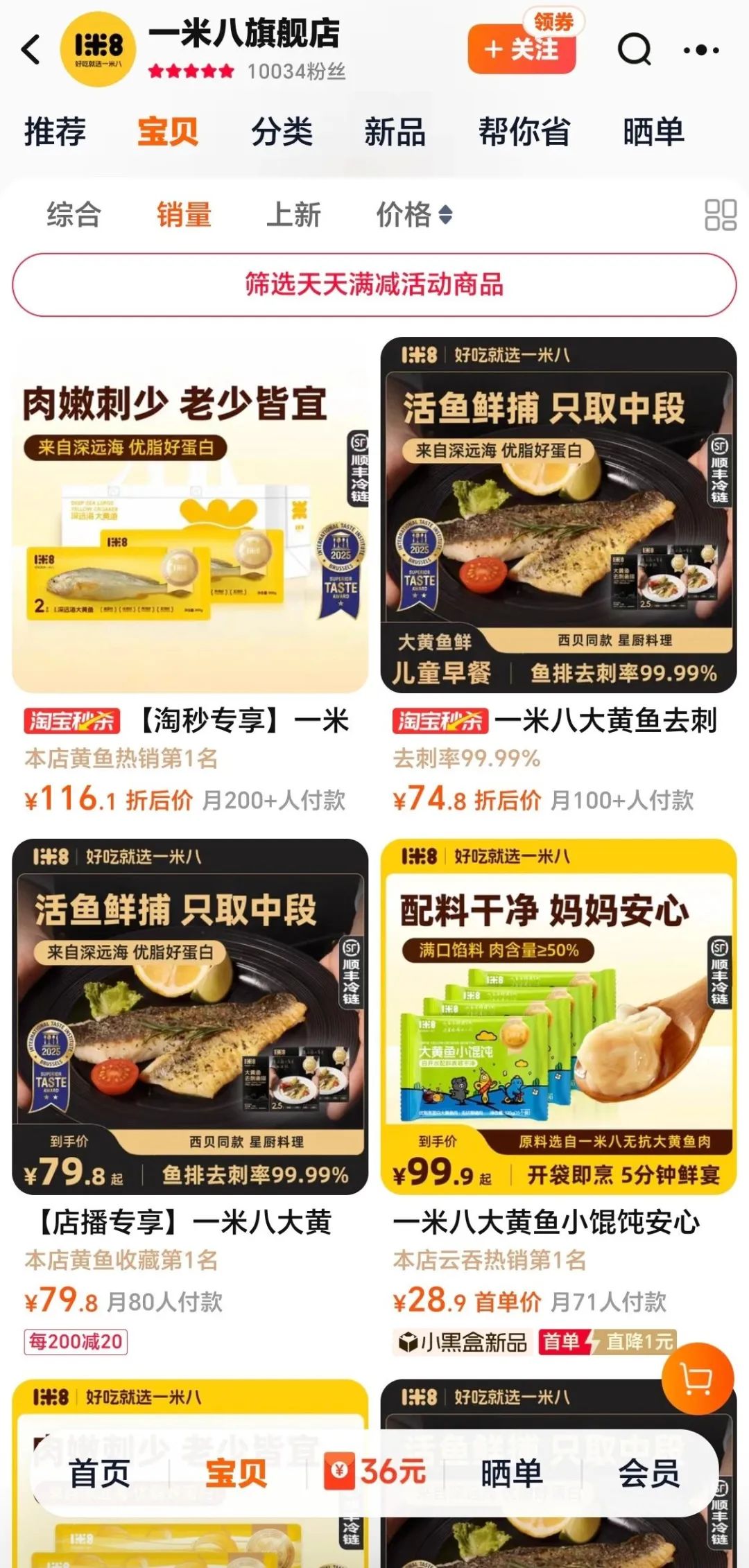 2024年,“一米八”開了一家天貓旗艦店。目前,該店鋪的粉絲數(shù)量已突破一萬,上架了多款生鮮產(chǎn)品。其中,一款售價116元起的深海大黃魚,銷量達到了5000多件。