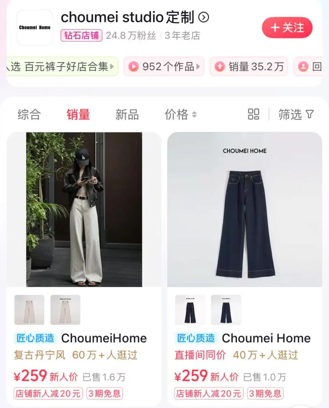 《節(jié)點(diǎn)財(cái)經(jīng)》觀察到,銷量最好的牛仔褲單價(jià)200+以上,從品牌陣地來看,Choumei Home店播的銷量加上65%復(fù)購率形成的黏性,給了Choumei Home做品牌極大的安全感。特別是主理人劉權(quán)仍然堅(jiān)持著做口碑,他對(duì)于消費(fèi)者的評(píng)價(jià)只看不好的部分,這樣才能凸顯出產(chǎn)品問題在哪里,買家特別在意的點(diǎn)在哪里,再根據(jù)買家提供的數(shù)據(jù),繼續(xù)優(yōu)化產(chǎn)品。