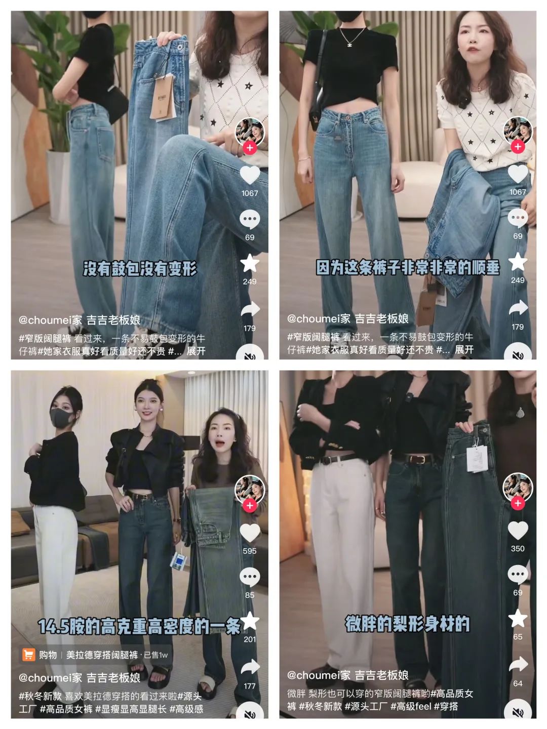 例如吉吉老板娘的賬號(hào)中,吉吉老板娘和主播們各司其職,主播負(fù)責(zé)展示,吉吉老板娘對(duì)褲子的版型、適合的身材、穿搭建議等言之有物: