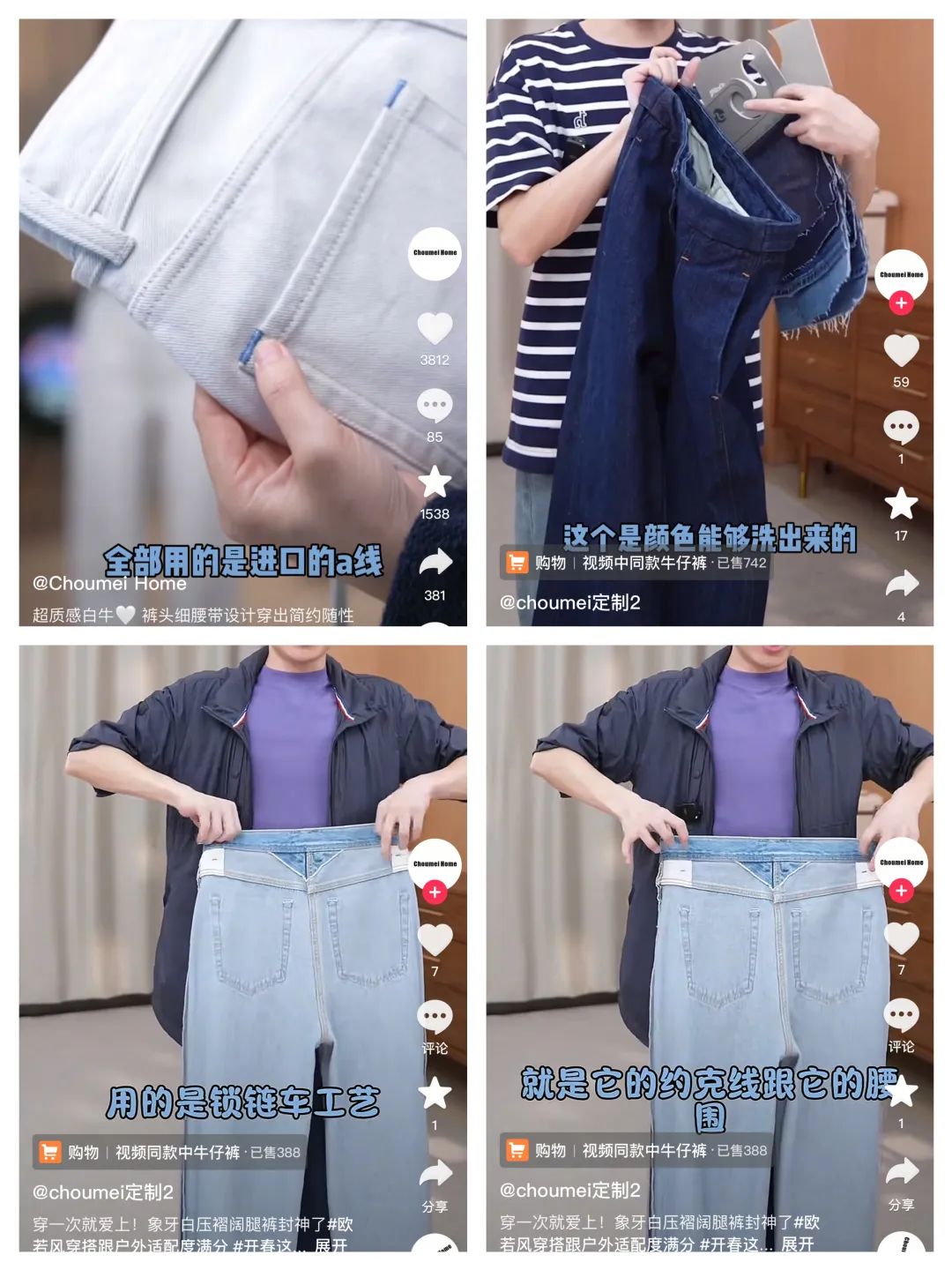 翻看Choumei Home的矩陣賬號(hào)的內(nèi)容,一部分是關(guān)于牛仔褲版型的介紹,另一部分則是關(guān)于面料的細(xì)致介紹,每一款面料的性能、適合搭配的場(chǎng)景、舒適程度都具象化地展開在消費(fèi)者面前。