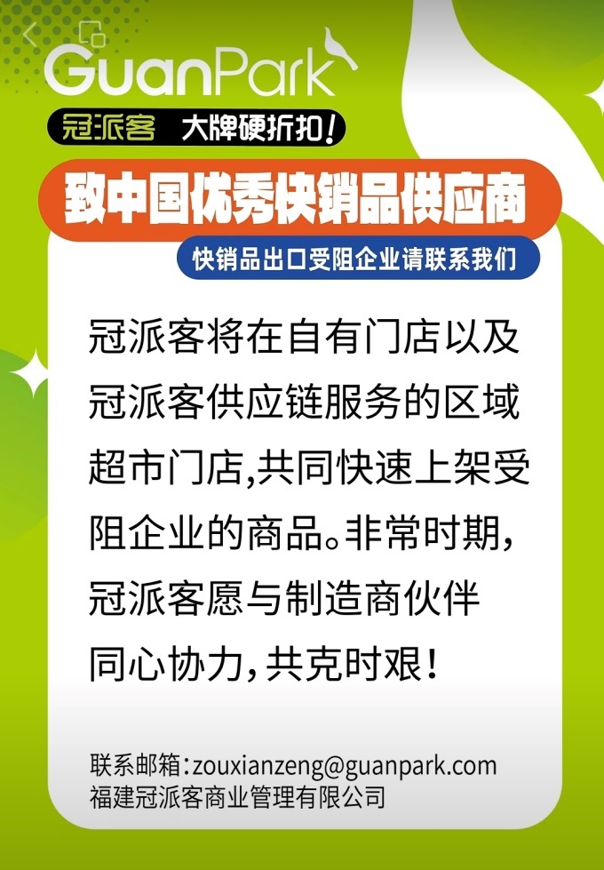 4月11日,冠派客在官方視頻號(hào)發(fā)布致中國(guó)優(yōu)秀快銷品供應(yīng)商的一封信,將在自有門(mén)店以及冠派客供應(yīng)鏈服務(wù)的區(qū)域超市門(mén)店,共同快速上架受阻企業(yè)的商品。