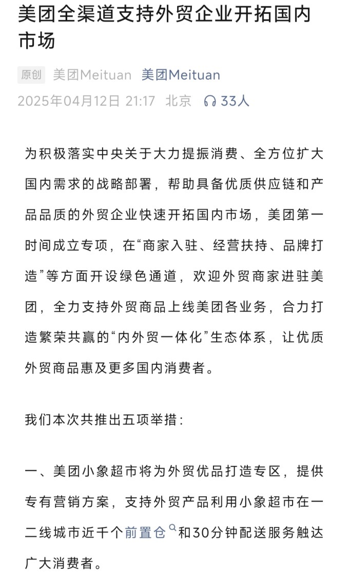 4月12日,美團宣布全渠道支持外貿(mào)企業(yè)開拓國內(nèi)市場,并已成立專項,推出五項舉措,在“商家入駐、經(jīng)營扶持、品牌打造”等方面開設綠色通道,歡迎外貿(mào)商家進駐美團,全力支持外貿(mào)商品上線美團各業(yè)務,合力打造繁榮共贏的“內(nèi)外貿(mào)一體化”生態(tài)體系,讓優(yōu)質外貿(mào)商品惠及更多國內(nèi)消費者。