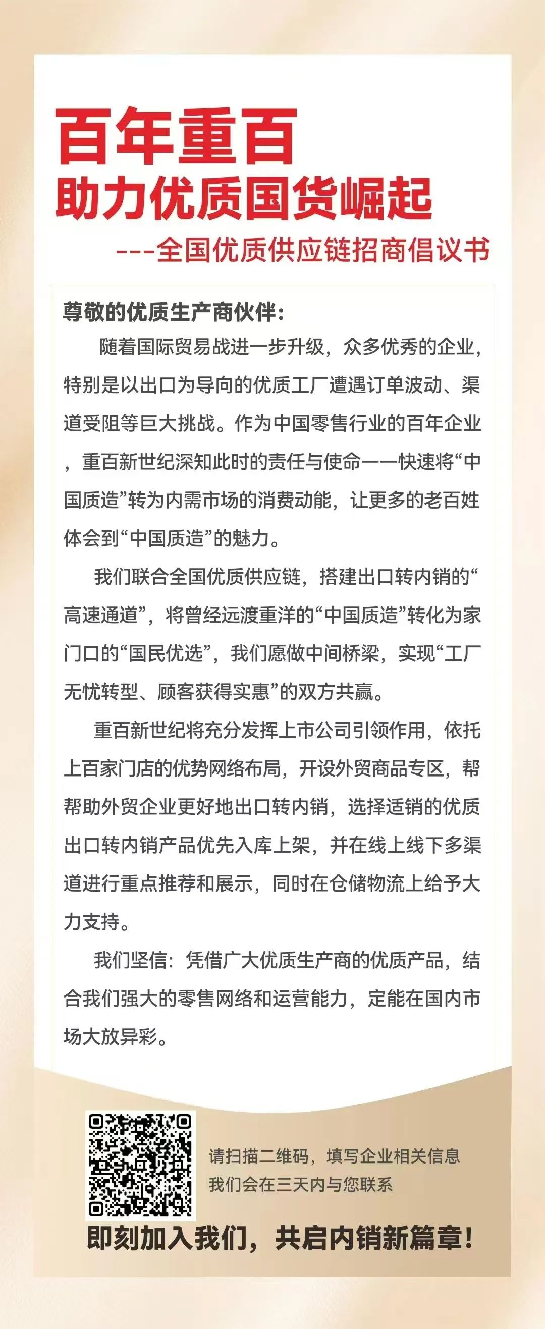 作為中國零售行業(yè)百年企業(yè),重百提出將“中國質造”轉化為內(nèi)需市場的消費動能,通過旗下重百超市和新世紀超市廣泛的零售渠道優(yōu)勢,幫助外貿(mào)企業(yè)實現(xiàn)“工廠無憂轉型、顧客獲得實惠”的雙贏目標。