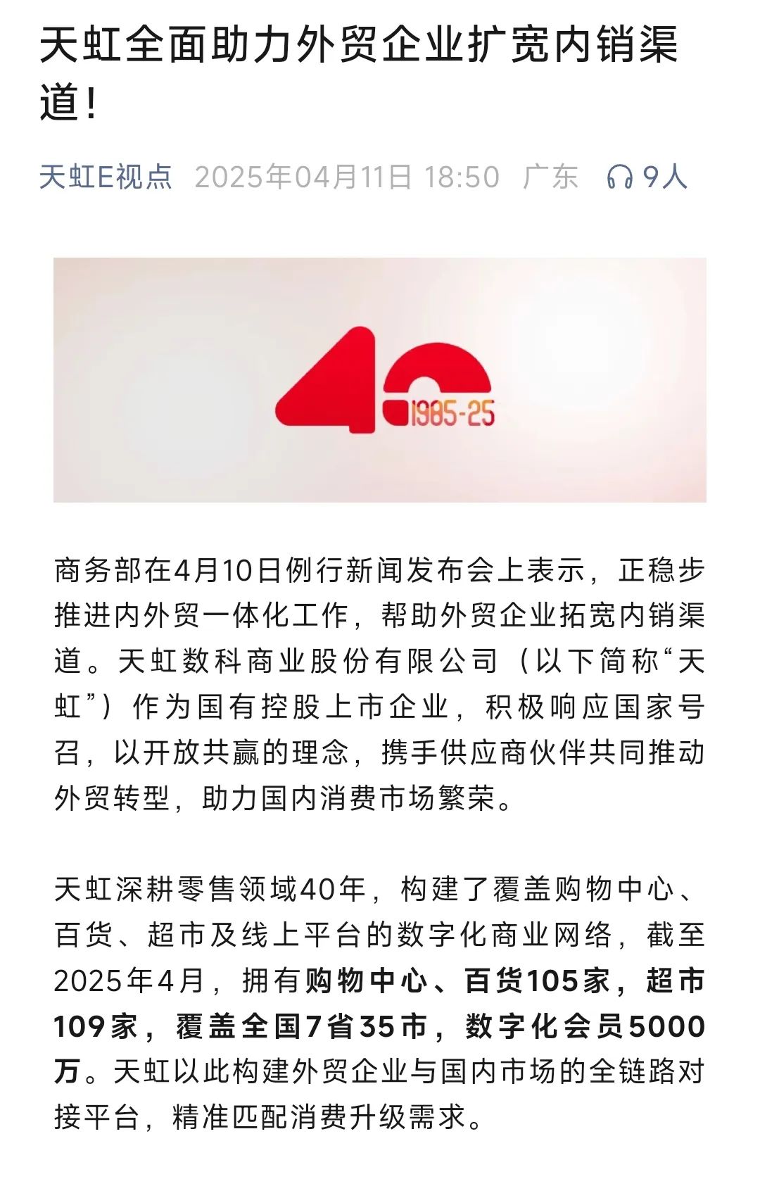 天虹深耕零售領域40年,構建了覆蓋購物中心、百貨、超市及線上平臺的數(shù)字化商業(yè)網(wǎng)絡,截至2025年4月,擁有購物中心、百貨105家,超市109家,覆蓋全國7省35市,數(shù)字化會員5000萬。天虹以此構建外貿(mào)企業(yè)與國內(nèi)市場的全鏈路對接平臺,精準匹配消費升級需求。
