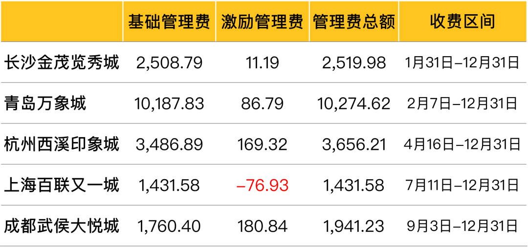 最直接的杭州西溪印象城,直接對(duì)超額部分統(tǒng)一取20%。你甚至可以據(jù)此反算,2024年4月16日-12月31日的激勵(lì)管理費(fèi)是169.32萬元,就代表著期間內(nèi)的NOI實(shí)現(xiàn)值比目標(biāo)多約850萬元。