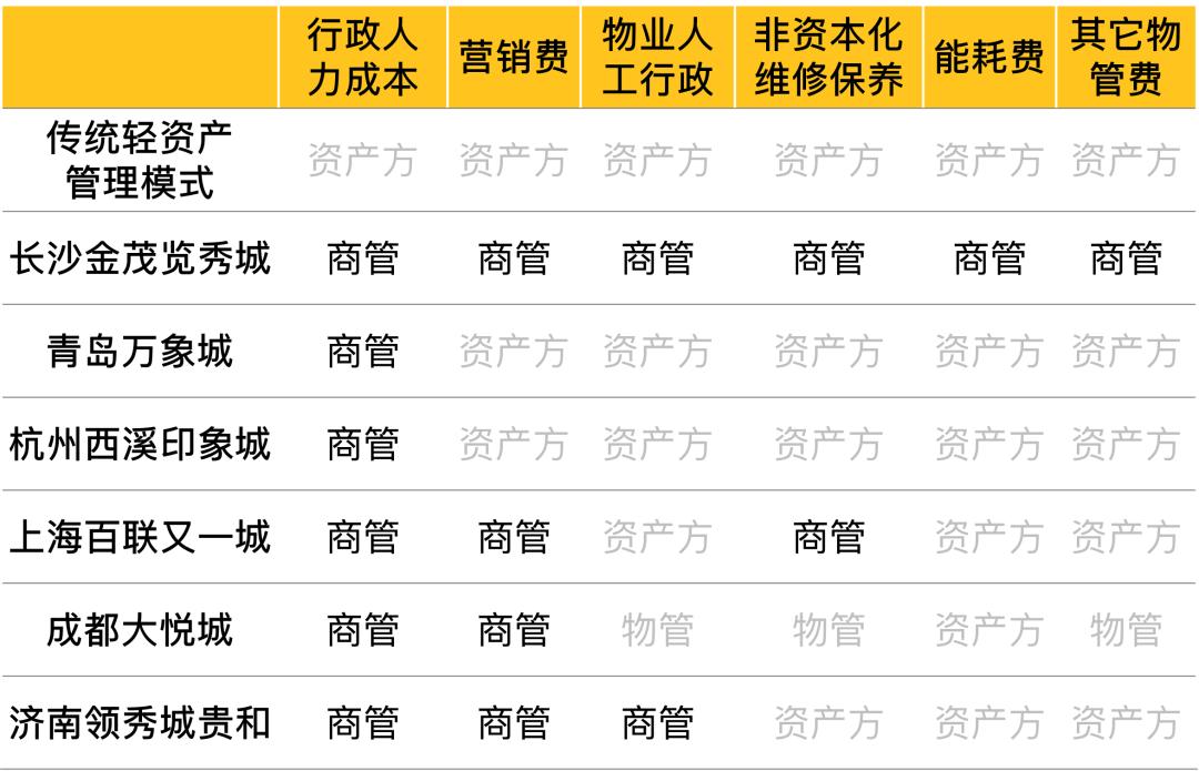 相對(duì)而言,這種模式把最具有壓降空間的人工成本留在了商管公司,而資產(chǎn)方需要承擔(dān)的是相對(duì)更剛性的成本。因此更有利于商管方面。