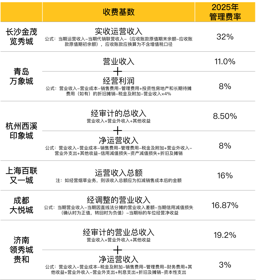 先來說基礎(chǔ)管理費(fèi)。在計(jì)費(fèi)口徑上,大部分項(xiàng)目使用的是營(yíng)業(yè)收入或運(yùn)營(yíng)收入,但杭州西溪印象城和濟(jì)南領(lǐng)秀城貴和使用的是總收入,包括了“營(yíng)業(yè)外收入+其他收益”。