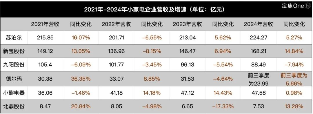 「定焦One」選取了六家小家電行業(yè)的上市公司作為代表,通過(guò)它們2021年-2024年的業(yè)績(jī),觀察這一行業(yè)的走勢(shì)。