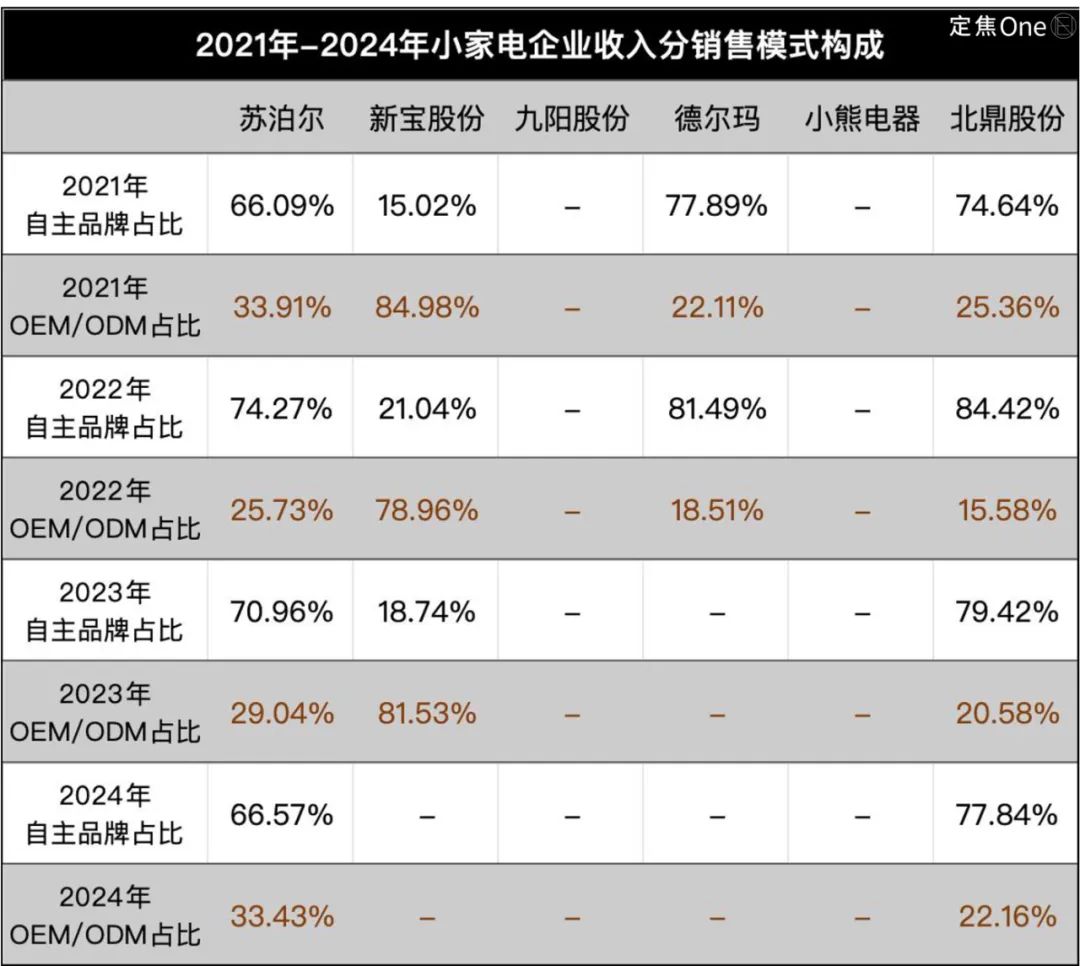 2024年,六家公司中,新寶股份和北鼎股份有超過(guò)10%的營(yíng)收增速,其他四家均呈現(xiàn)漲不動(dòng)或負(fù)增長(zhǎng)的趨勢(shì)。值得注意的是,新寶股份的增速更多也是靠海外代工業(yè)務(wù)拉動(dòng)。