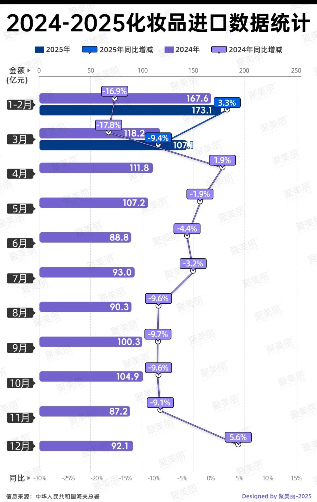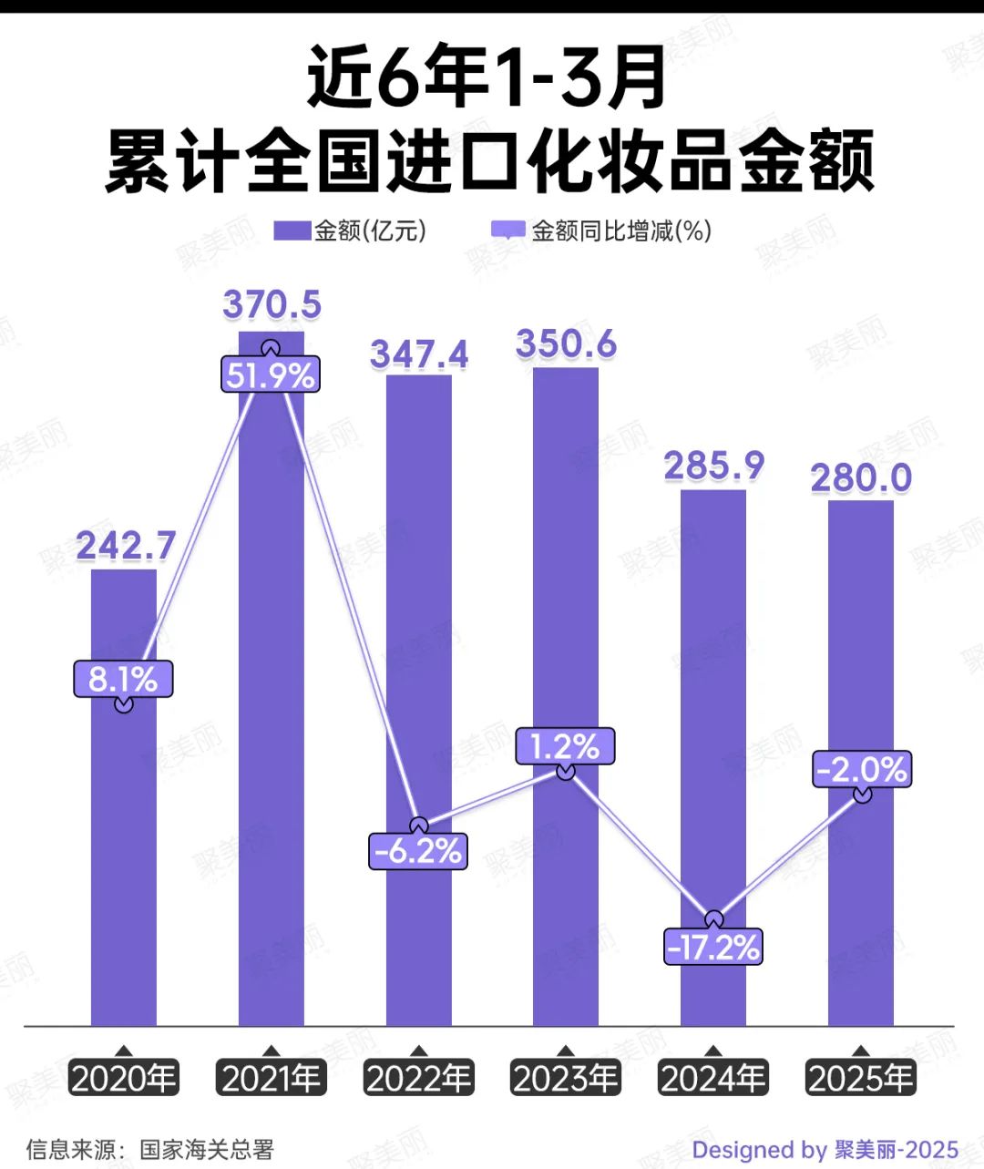 從前文來看,2025年3月及Q1整體表現(xiàn)不如人意,即使2025年1-2月進口化妝品數(shù)據(jù)呈現(xiàn)回暖跡象,聚美麗在《漲14%!進口化妝品等來春天?》一文中,已進行過相關(guān)分析,不再贅述。