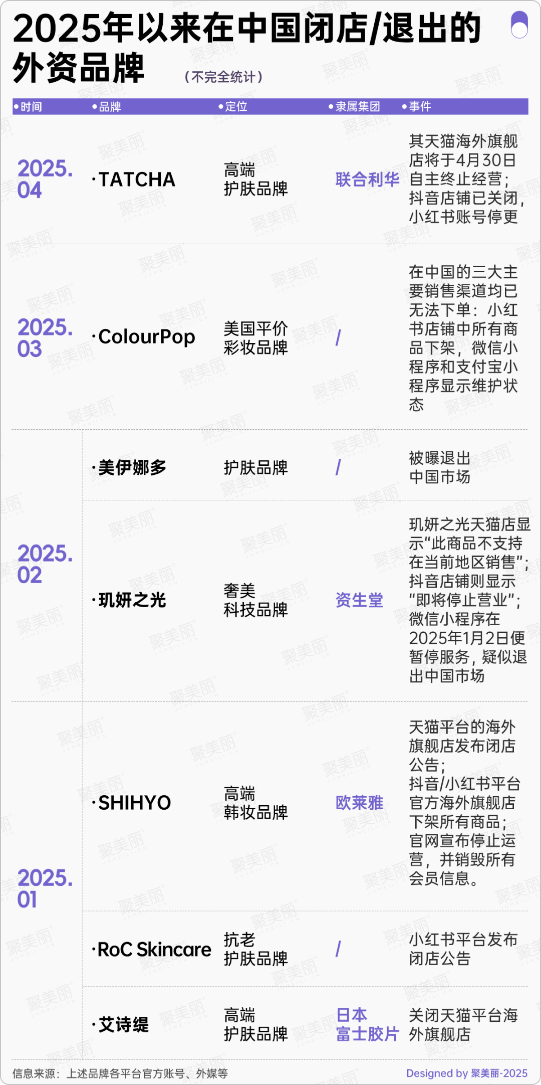 另外,外資美妝品牌在中國市場的“敗退”仍然在持續(xù)上演,據(jù)聚美麗不完全統(tǒng)計,僅2025開年至今,在中國閉店、退出的外資品牌,就有7例。