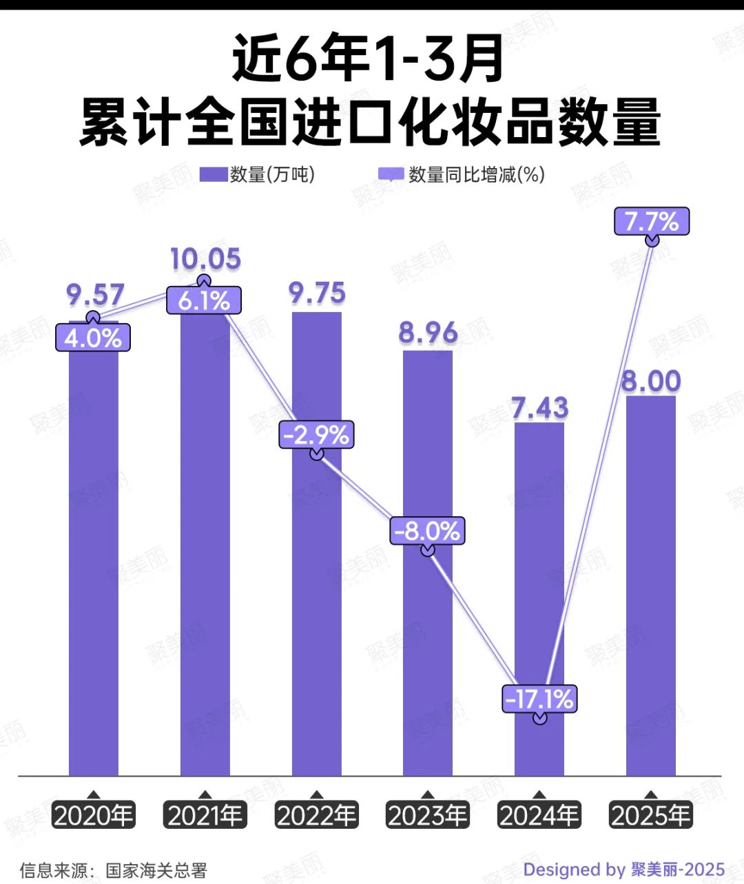 再從季度來看,在2025年第一季度,進口化妝品數(shù)量同比個位數(shù)增長,而金額下跌2.0%。