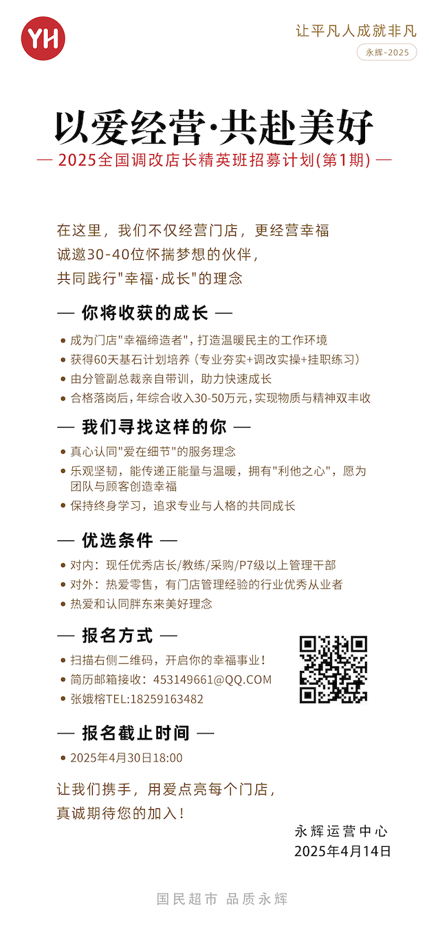 2025年4月14日,永輝超市發(fā)布2025全國調(diào)改店長精英班招募計劃(第1期)。