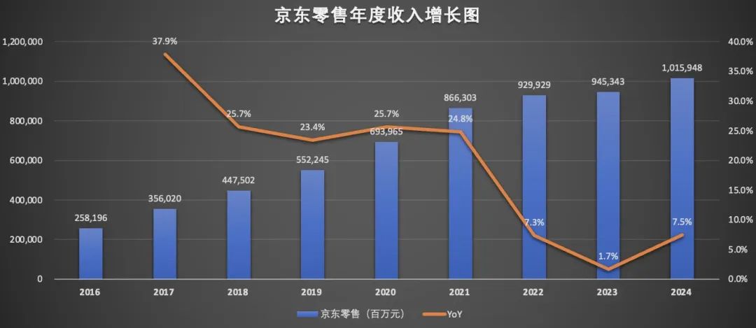 京東核心3C品類增長疲軟,京東零售收入增速放緩,最近三年僅實現(xiàn)個位數(shù)增長,2024年京東零售收入同比增長7.5%。