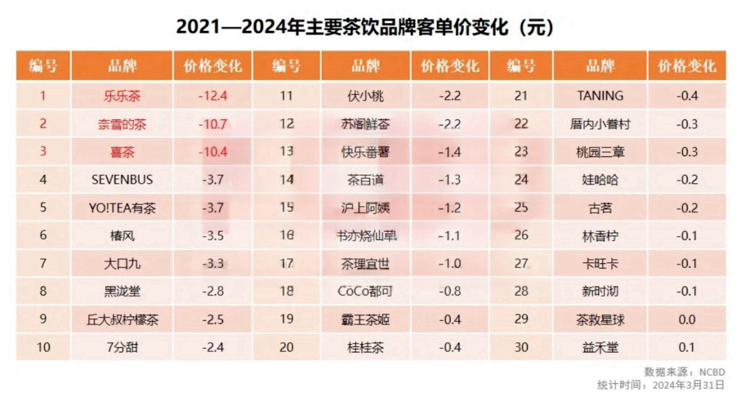 新式茶飲市場(chǎng)這幾年的確在價(jià)格方面陷入了膠著狀態(tài),據(jù)餐寶典的數(shù)據(jù)統(tǒng)計(jì),2021年至今2024年期間,包括奈雪的茶、喜茶客單價(jià)下調(diào)幅度均大于10元。