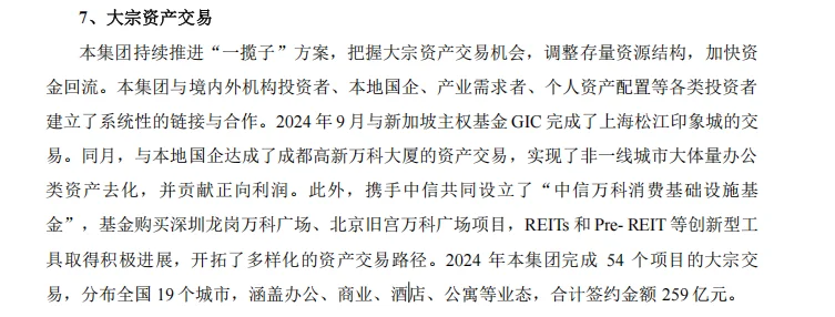 另一方面,萬(wàn)科全年完成了54個(gè)大宗資產(chǎn)交易,259億元大宗交易額穩(wěn)居行業(yè)榜首,其中包括成都高新萬(wàn)科大廈這類非一線城市大體量辦公物業(yè),以及與新加坡主權(quán)基金GIC完成了上海松江印象城交易。