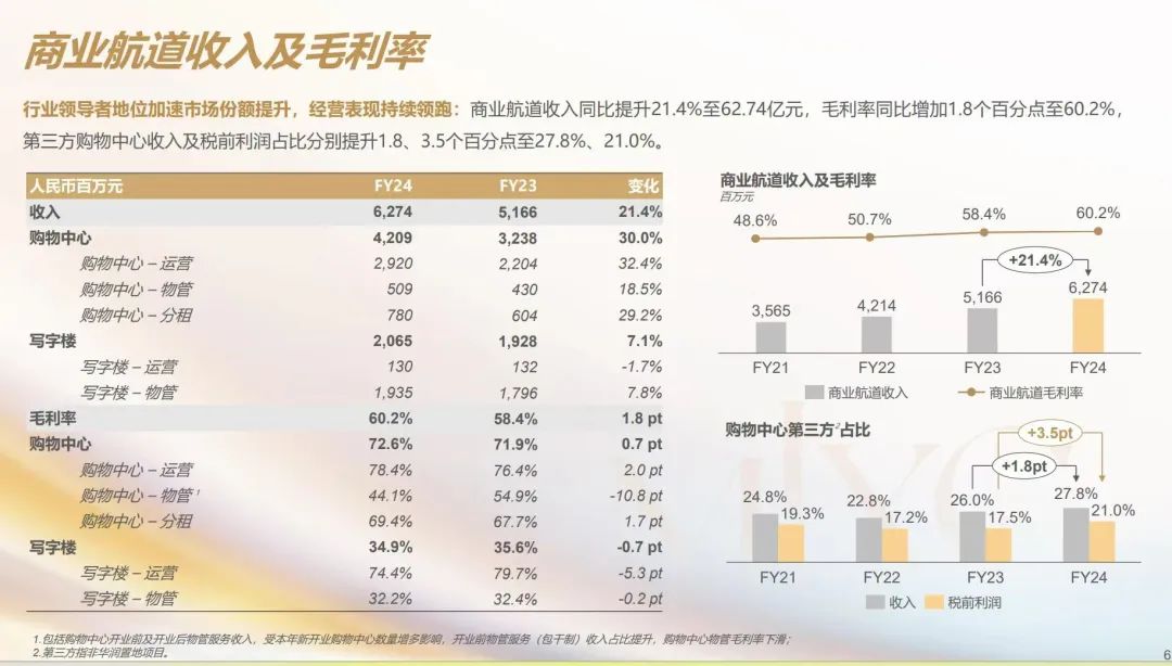 華潤(rùn)萬(wàn)象生活實(shí)現(xiàn)營(yíng)業(yè)收入170.4億元,同比增長(zhǎng)15.4%;核心凈利潤(rùn)35.1億元,同比增長(zhǎng)20.1%。毛利率提升至32.9%。21.4%增長(zhǎng)的商業(yè)航道收入,疊加60.2%的超高毛利率,驗(yàn)證了輕資產(chǎn)模式的盈利潛力。其中,來自購(gòu)物中心的商業(yè)運(yùn)營(yíng)管理服務(wù)收入為42.09億元,同比增長(zhǎng)30.0%,占總收入的24.7%。