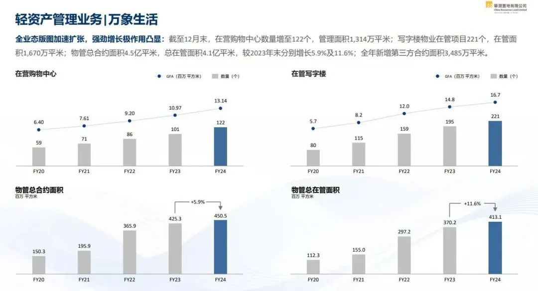 截至2024年底,華潤(rùn)萬(wàn)象生活管理在營(yíng)購(gòu)物中心122座,實(shí)現(xiàn)零售額2150億元,同比增長(zhǎng)18.7%;業(yè)主端租金收入262億元,同比增長(zhǎng)19.2%。