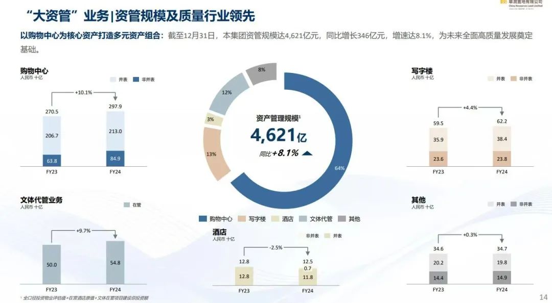主要持有物業(yè)全口徑收入74.64億元,同比上漲12%。集中商業(yè)在營(yíng)項(xiàng)目47個(gè),2024新開業(yè)10個(gè)項(xiàng)目,其中輕資產(chǎn)管理項(xiàng)目4個(gè)。