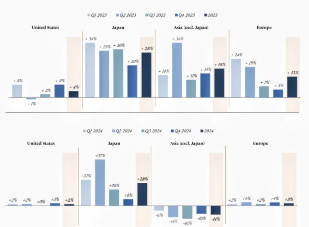 此外,值得注意的是,此次LVMH集團在日本市場也表現(xiàn)不佳。財報顯示,2025年Q1該市場銷售額有機下滑1%。