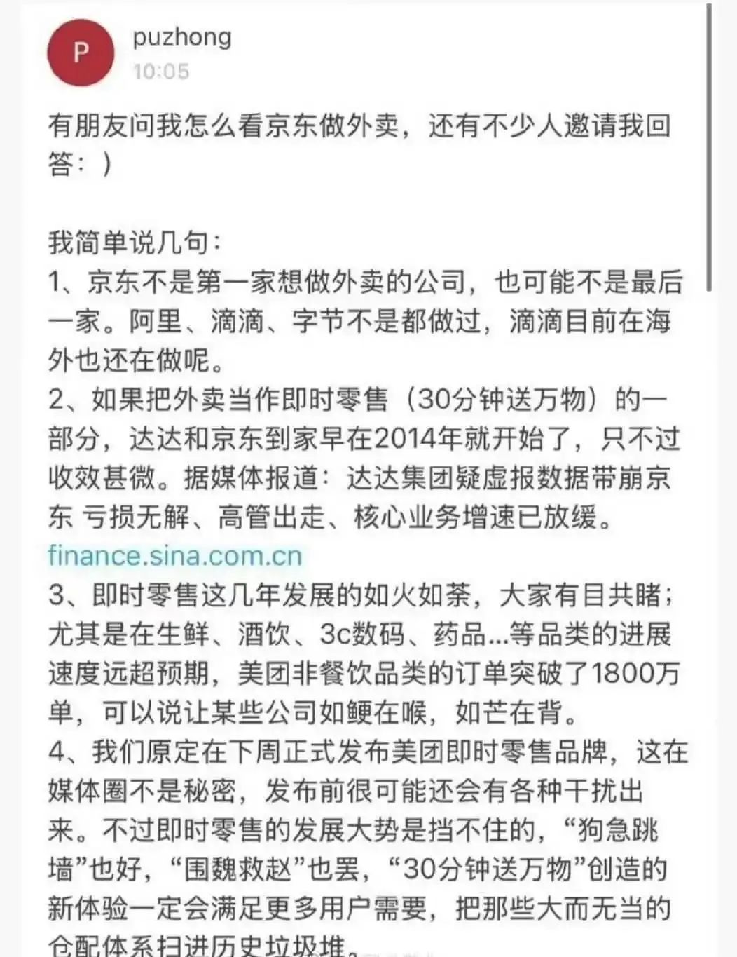 首先,他開門見山直接點(diǎn)明“京東不是第一家想做外賣的公司,也可能不是最后一家”,并輕描淡寫地指出:“如果把外賣當(dāng)作即時(shí)零售(30分鐘送萬(wàn)物)的一部分,達(dá)達(dá)和京東到家早在2014年就開始了,只不過(guò)收效甚微!