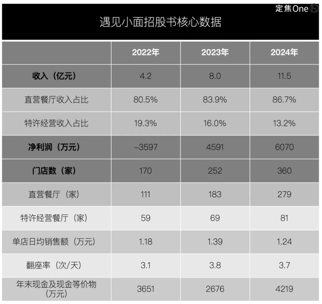 而以直營為主、加盟為輔的遇見小面,在2022年至2024年收入增長的同時,盈利情況也逆轉(zhuǎn)了:2022年虧損3597萬,2023年、2024年分別盈利4591萬元、6070萬元,這三年間,凈利潤率從-8.6%轉(zhuǎn)正到5.2%。