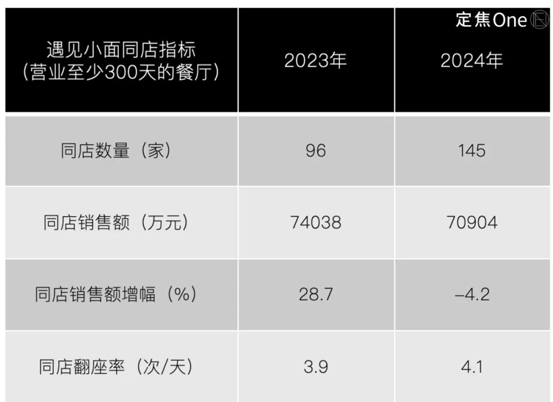 為了吸引客流,2022年-2024年,遇見小面的客單價降到32元,不過,同店(營業(yè)至少300天的餐廳)翻座率微增0.2次(從3.9升到4.1),單店收益縮水: