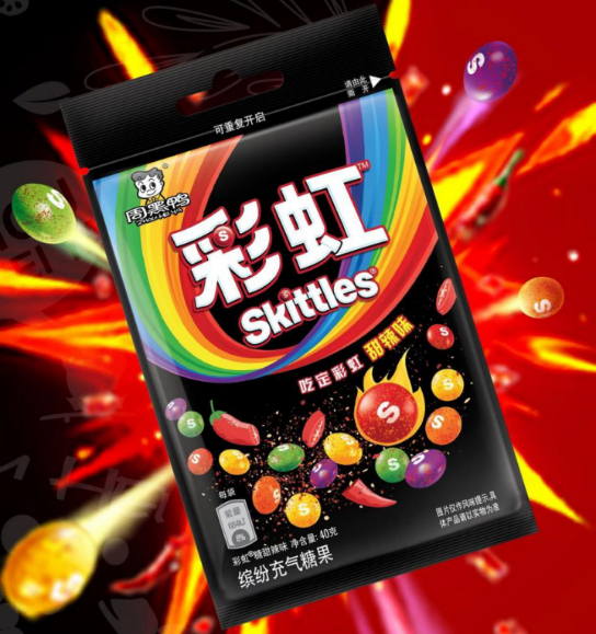 在休閑糖果領(lǐng)域,周黑鴨還聯(lián)動過瑪氏,推出甜辣味彩虹糖。這款產(chǎn)品包裝設(shè)計將周黑鴨經(jīng)典的黑金元素與彩虹糖的七彩斑斕融合。根據(jù)品牌介紹,產(chǎn)品的辣味外殼脆,內(nèi)芯軟,五彩繽紛果味甜辣疊加,嚼出驚奇口感。