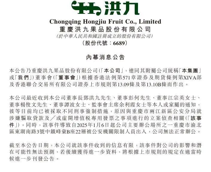 4月16日晚,洪九果品發(fā)布公告稱(chēng),收到本人或家屬通知,董事長(zhǎng)鄧洪九,執(zhí)行董事彭何、江宗英、楊俊文、譚波及監(jiān)事會(huì)主席余利霞,均已被采取不同刑事強(qiáng)制措施!熬蜕嫦域_取貸款及/或虛開(kāi)增值稅專(zhuān)用發(fā)票之事項(xiàng),進(jìn)行的立案?jìng)刹橄嚓P(guān)!