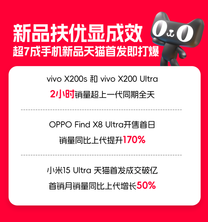 4月,OPPO年度旗艦新品Find X8 Ultra天貓首發(fā),開售首日累計銷量同比上代提升170%,創(chuàng)下歷史新高。2月27日,小米年度旗艦新品15 Ultra天貓首發(fā)成交破億,拿下新品成交第一,在天貓首銷月銷量對比上代增長50%。