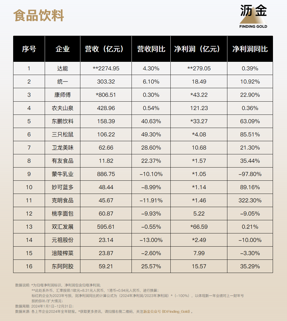 2024年,農(nóng)夫山泉營(yíng)收428.96億元,同比增長(zhǎng)0.54%,凈利潤(rùn)121.23億元,同比增長(zhǎng)0.36%。