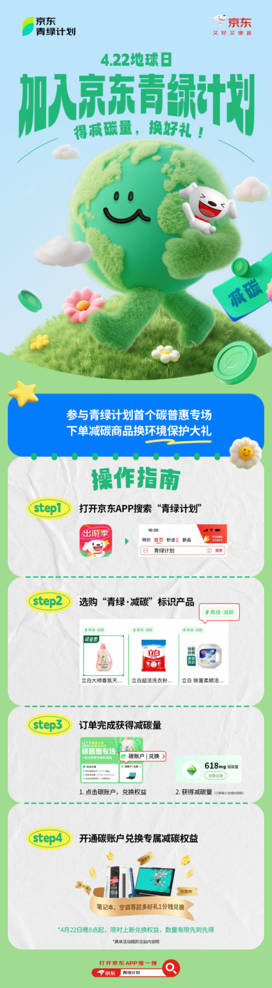 4月22日,用戶登錄京東APP搜索“青綠計劃”,即可選購“青綠?減碳”標(biāo)識產(chǎn)品,獲得綠色運輸過程當(dāng)中產(chǎn)生的相應(yīng)減碳量,當(dāng)日晚8點起憑此兌換限量“華碩天選5游戲本”、“美的新一級能效空調(diào)”、“雀巢速溶美式黑咖啡”等專屬大牌驚喜好禮和大額優(yōu)惠券。