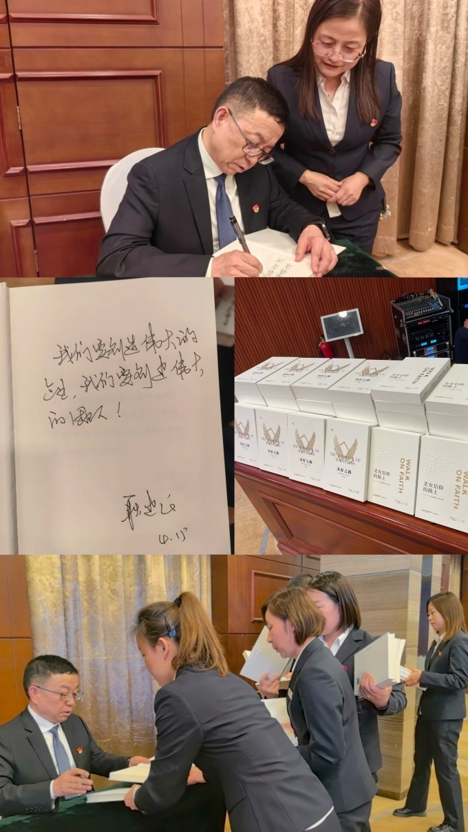 耿建民向?qū)W員代表贈送學習書籍于東來新著作《美好之路》修訂版、《走在信仰路上》并現(xiàn)場簽名