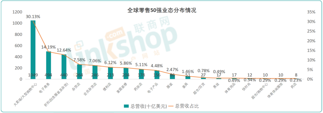 從業(yè)態(tài)上看,全球TOP50中,大賣(mài)場(chǎng)/大型購(gòu)物中心業(yè)態(tài)總營(yíng)收占比30.1%,相對(duì)2024年榜單數(shù)據(jù)提升0.9個(gè)百分點(diǎn);折扣店(含食品、服裝和雜貨折扣)占比12.64%,相對(duì)2024年榜單數(shù)據(jù)提升0.34個(gè)百分點(diǎn),會(huì)員店7.06%,各業(yè)態(tài)具體如下:
