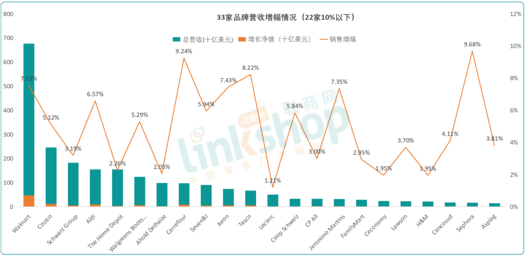 從占比來(lái)看,前10強(qiáng)總營(yíng)收占前50強(qiáng)的62%,集中度進(jìn)一步提升;而沃爾瑪和亞馬遜占比三成。