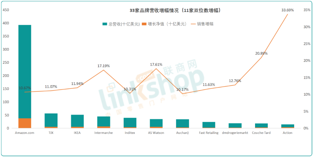 (1)33家企業(yè)中,營(yíng)收雙位數(shù)增長(zhǎng)的有11家。增幅最為突出Action,2024年榜單數(shù)據(jù)為112.2億美元,2025年達(dá)到150億美元,增長(zhǎng)33.7%;其次為Couche-Tard,營(yíng)收增幅21%;排名第二的亞馬遜,營(yíng)收也獲得10.7%的雙位數(shù)增長(zhǎng)。