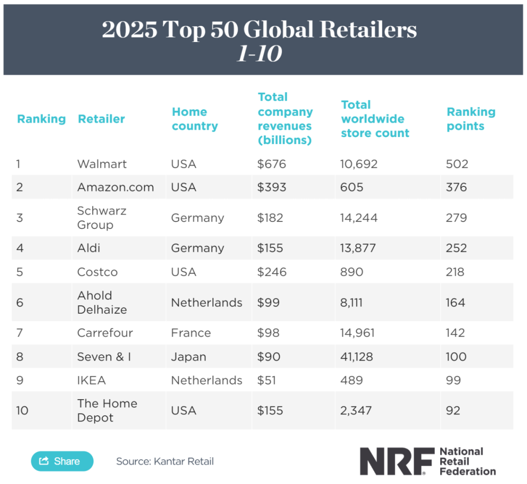 2025年全球零售50強(qiáng)出爐,中國(guó)有哪些上榜?