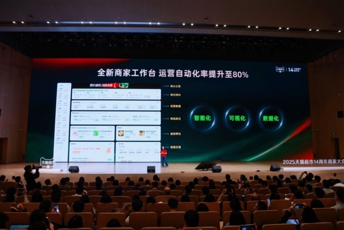 商家大會上,天貓超市正式推出全新的商家操作后臺,新增了智能待辦、趨勢孵化、智能推廣等板塊,全面接入AI,商家運營的自動化率提升至80%。“對于日常高頻的運營工作,過去我們商家需要在釘釘群里,或者點擊后臺的各個板塊,才能定位到一些運營問題。在最新的待辦模塊里,商家只需要喚起AI經(jīng)營助手,點擊一鍵采納,所有的待辦都可以完成!毖M介紹道。