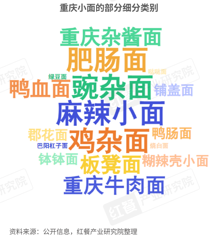 重慶小面分廣義和狹義,廣義的重慶小面包括重慶雜醬面、肥腸面、鴨血面、豌雜面、鋪蓋面、麻辣小面、雞雜面、板凳面、糊辣殼小面和重慶牛肉面等多種類別。這些小面的細(xì)分類別不僅豐富了重慶小面的多樣性,也滿足了不同消費者的口味偏好。本報告的研究對象為廣義的重慶小面。