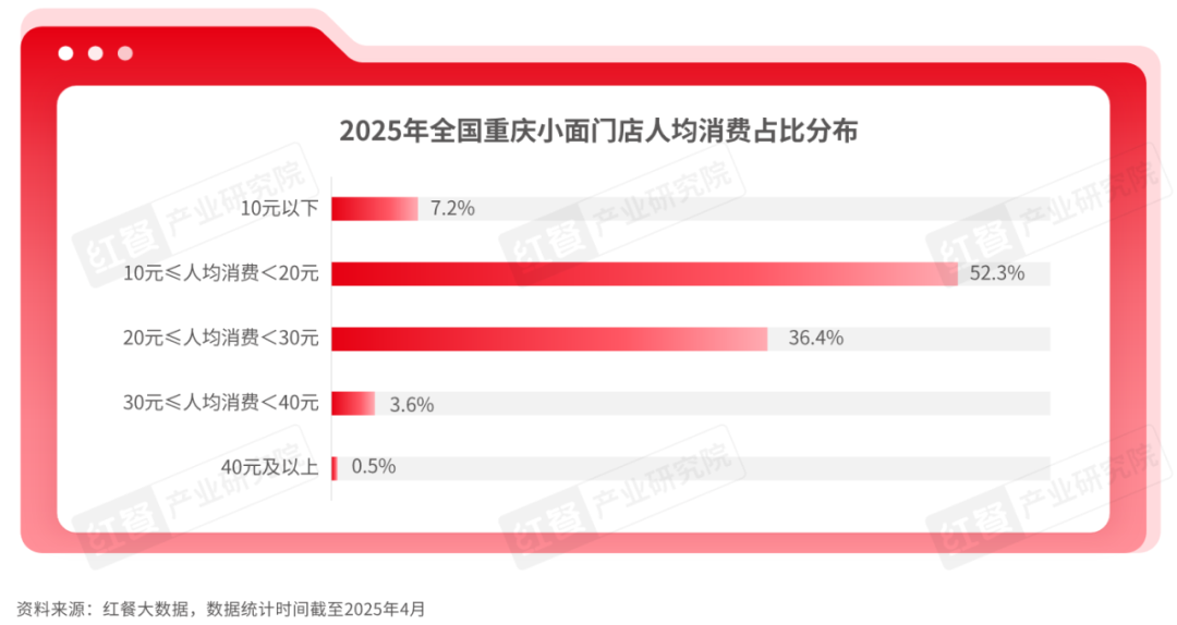從人均消費來看,大多數(shù)重慶小面的門店在30元以下的價格帶競爭。據(jù)紅餐大數(shù)據(jù),截至2025年4月,人均消費不到20元的重慶小面門店數(shù)占比達(dá)到了59.5%。其中,有52.3%的重慶小面門店人均消費在10~20元,例如渝味重慶小面、秦云老太婆攤攤面、呼啦面館、十八梯鄧凳面、嗨椒小面等品牌均在此區(qū)間。