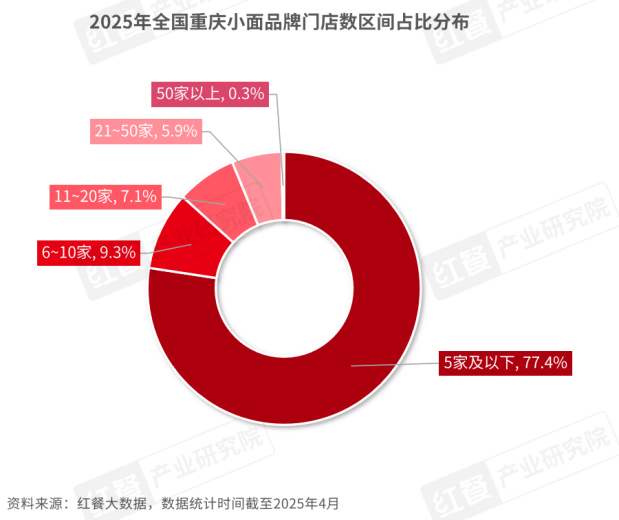 從品牌的規(guī);潭葋砜,近八成重慶小面品牌門店數(shù)在5家及以下,賽道規(guī);潭炔桓。據(jù)紅餐大數(shù)據(jù),截至2025年4月,全國重慶小面門店數(shù)超3.0萬家。就重慶小面品牌來看,77.4%的品牌門店數(shù)在5家及以下,門店數(shù)超過50家的品牌數(shù)占比僅有0.3%。