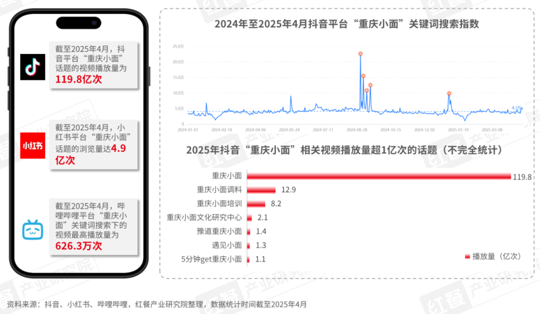 近年來,重慶小面呈現(xiàn)較高的發(fā)展熱度。2024年至2025年4月,在抖音平臺上,“重慶小面”關(guān)鍵詞的搜索指數(shù)穩(wěn)中有所爆發(fā),出現(xiàn)了數(shù)個波峰點,單日最高峰值達(dá)到了22.7萬。