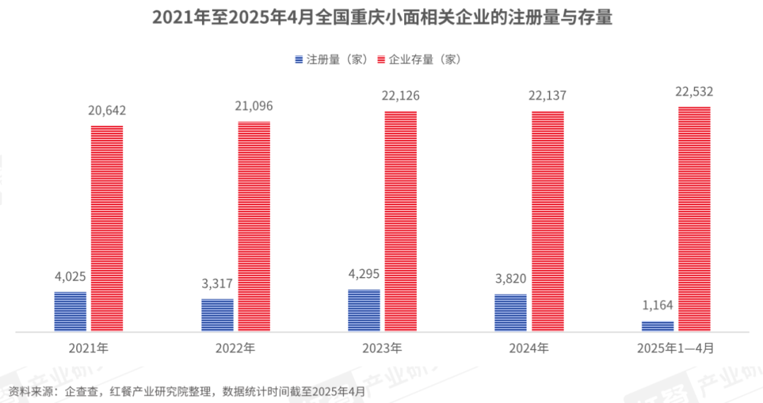 企查查數(shù)據(jù)顯示,2024年全年,全國重慶小面相關(guān)企業(yè)的注冊量超3,800家,相關(guān)企業(yè)的存量為22,137家,同比增長了0.5%。截至2025年4月,重慶小面相關(guān)企業(yè)的存量近2.3萬家。