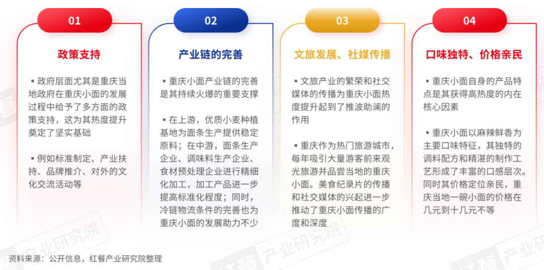 重慶小面之所以能保持較高的熱度,主要有四大因素的驅(qū)動,即政策支持;產(chǎn)業(yè)鏈的完善;文旅發(fā)展與社媒傳播;口味獨特與價格親民。